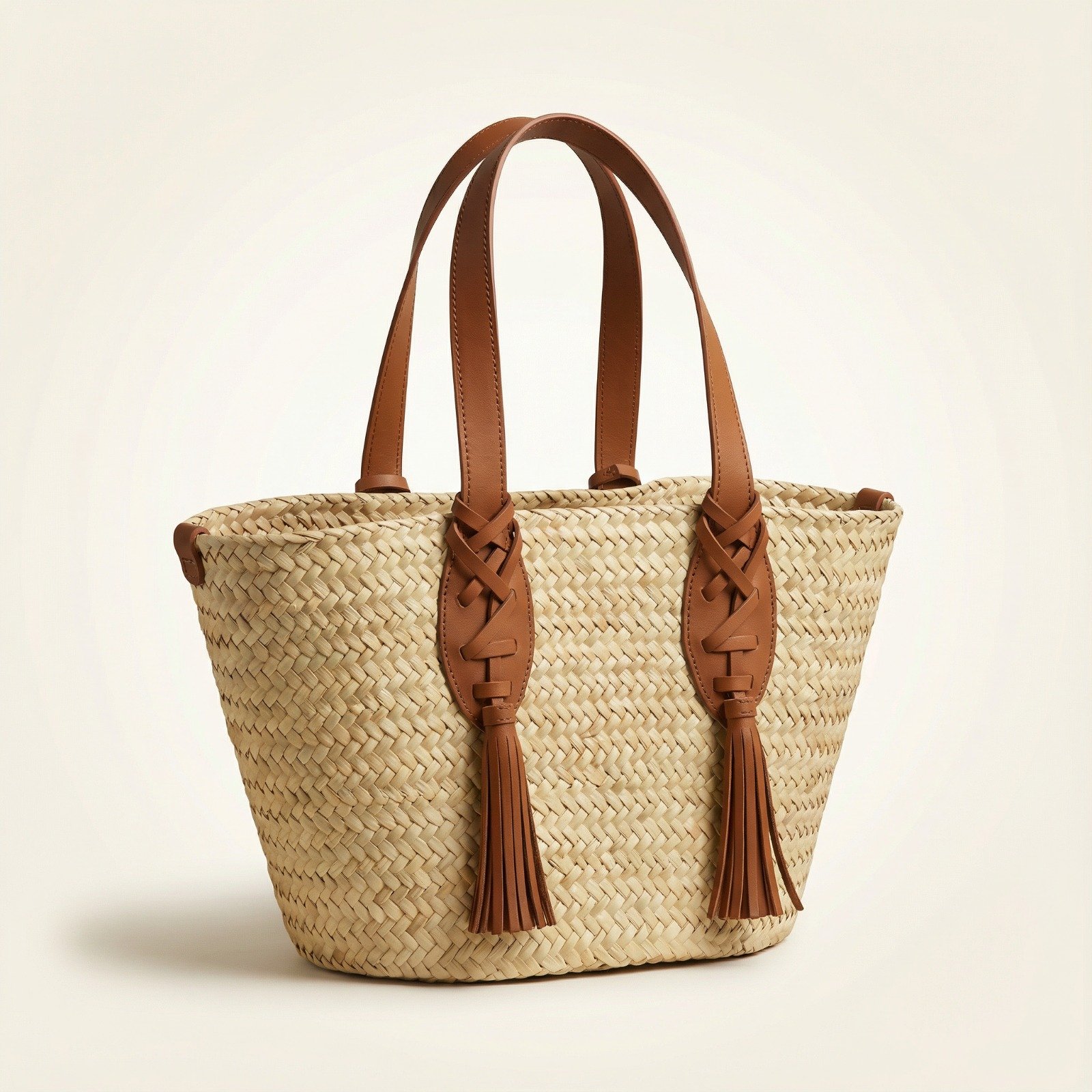 Entièrement tressé en feuilles de palmier naturelles, il est sublimé par du cuir véritable camel qui apporte structure, durabilité et sophistication.